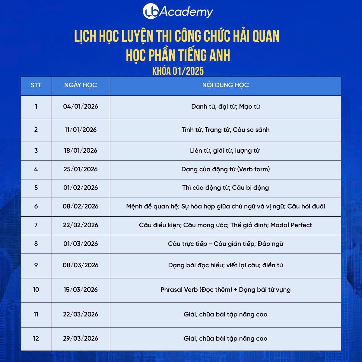 Nếu bạn đang tìm một lộ trình học trọn vẹn từ nền tảng đến luyện đề, kèm sẵn tài liệu ôn từ A-Z (kiến thức chung, tiếng Anh, nghiệp vụ), có thể tham khảo thêm các khóa luyện thi Hải quan tại UB Academy như một phương án để tiết kiệm thời gian tự mày mò và tập trung hơn vào việc học và luyện đề. Tại UB Academy, lộ trình thường đi theo các chặng rõ ràng: