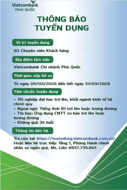 Theo tin nội bộ, Vietcombank dự báo sẽ lên tin tuyển dụng chỉ tiêu vào đầu tháng 4 các vị trí chuyên viên QHKH, GDV. Hiện tại đã có chi nhánh Phú Quốc lên tin. Chuẩn bị ngay!